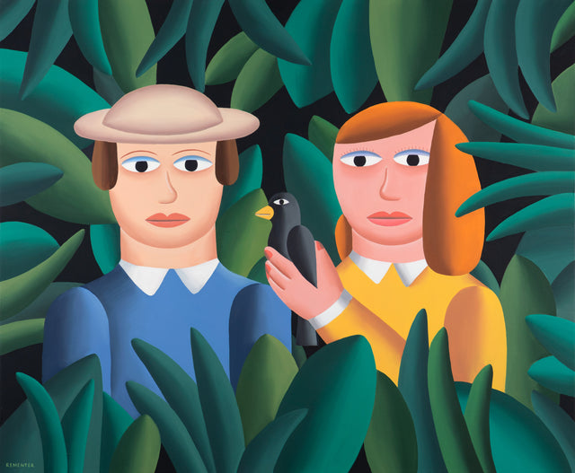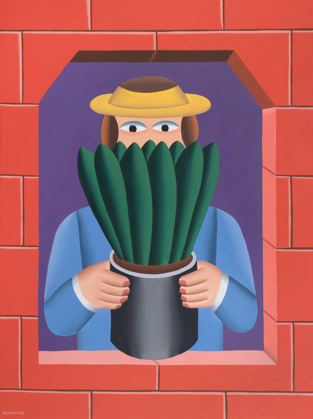 Rementer’s paintings feature pensive characters and still lives depicted in carefully staged interiors and landscapes. He uses bold colors and a flattened perspective to invite the viewer into his poetic visual world. His inspirations range from the Italian Renaissance, Léger, and Nathalie du Pasquier.